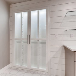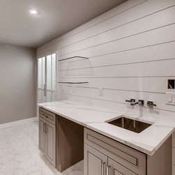 This farmhouse inspired basement features a shiplap accent wall with wet bar, lots of entertainment space a double-wide built-in wine rack and farmhouse style throughout.