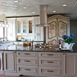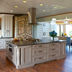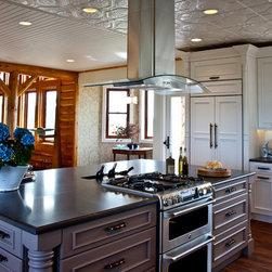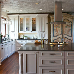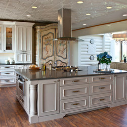 Transitional Kitchen with Traditional Hood & Contrasting Island