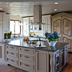 Traditional Kitchen with Blue Island & Brown Hood