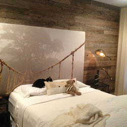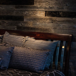 This reclaimed wood wall serves as a nice backdrop to this bedroom setting.