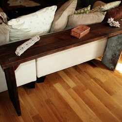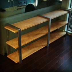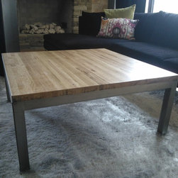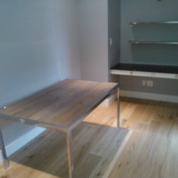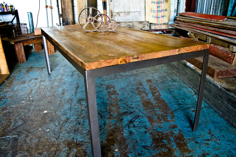 This 6' dining table was custom built for a client here in Austin. The tops are constructed from reclaimed oak, salvaged from the flooring of an 18 wheeler. The modern steel base is constructed from 2x2 square tube, finished with a waxed raw steel look. Can be built to custom sizes.