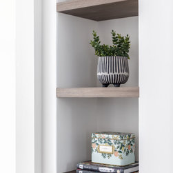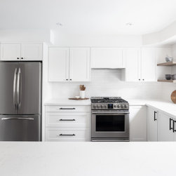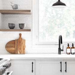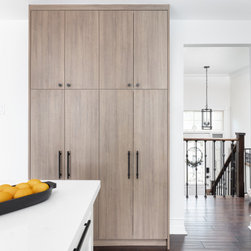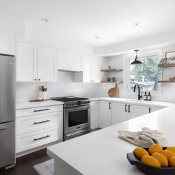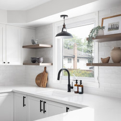 Keeping the style roots of the rest of the home in mind, designer Chloe Hardisty, of Hardisty Homes, revived the space while keeping it classic and paired Heritage Shaker in Pleasant White with striking matte black hardware and fixtures. The clean and tight colour palette gets a stroke of warmth with strategic additions of Coastal Lodge sprinkled throughout. The new stand-alone pantry answers the family's storage needs and allows for balance with open shelving for daily-use items to stay on display.