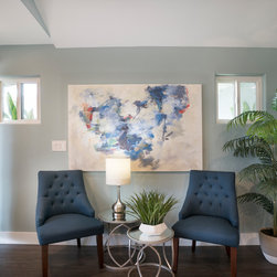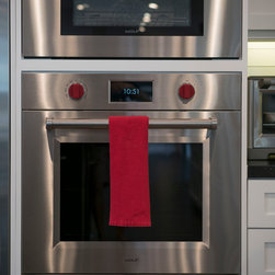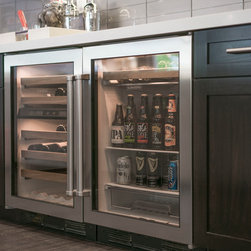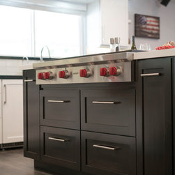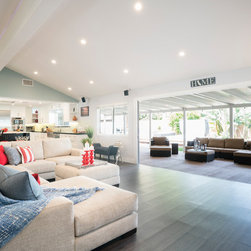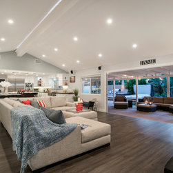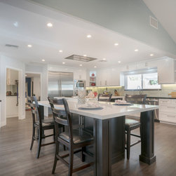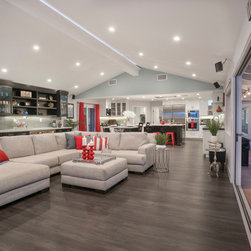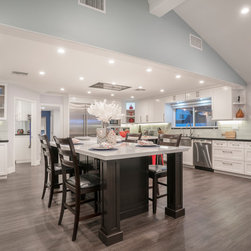 This was a full gut and remodel project. The old kitchen was demoed, and we designed this beautiful, "open space" kitchen with one purpose, Entertaining! The Island is large enough to seat 10 to 12 guests at a time for dining and entertaining. There is an abundance of storage and convenient touches, such as usb and electrical outlets inside drawers for hiding those pesky charging cables. This kitchen includes a full line of Wolf appliances including a built in espresso machine and full service ice machine. We also designed and had the dry bar and storage area as well. This includes two separate beverage refrigerators. One for wine and another for other refreshments which require colder temperatures. The old sliding door to the back yard was replaced for a much nicer accordion door set up. This gave the client the "open feel" he was searching for. We chose to go with darker more pet friendly floors with which and espresso cabinetry.