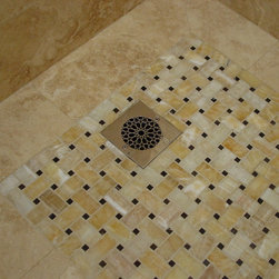 This shower floor is part of a travertine and Honey onyx bathroom we did. We use custom designed drains on all of our shower floors. The basket weave pattern onyx on the shower floor was accented with two horizontal stripes on the walls.