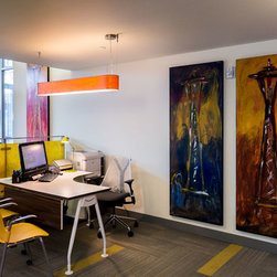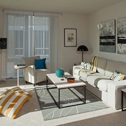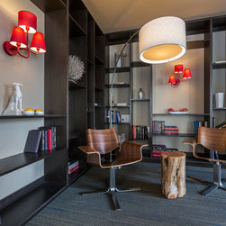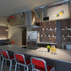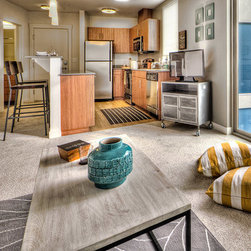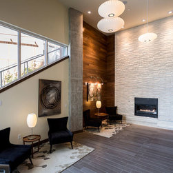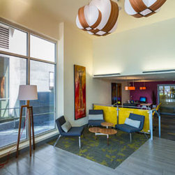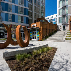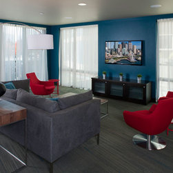 The interior finishes, giving a nod to the Mad Men era, include elements such as walnut veneer, travertine slab, Nelson bubble lamps, and even wallpaper that was designed in 1952. The color palette, inspired by colors found throughout the Seattle Center, was decidedly bright, including shades of green, red and blue. Expo's eclectic amenities include a demonstration kitchen, a coffee lounge and a library. Robin Chell Design was also retained to design the onsite leasing center and the model units.