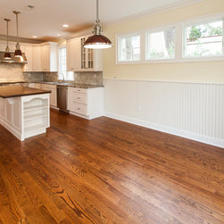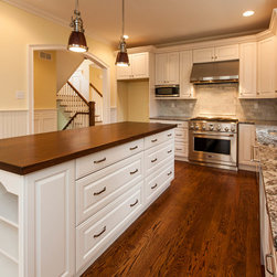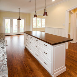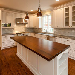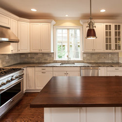 This kitchen has it all, dual pendant lighting to match the custom made wooden island, GE monogram appliances, custom cabinets and sleek granite and back splash.