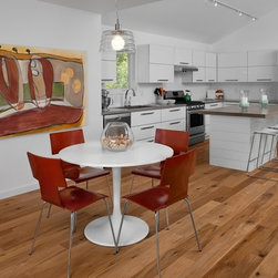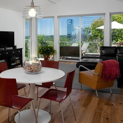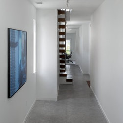 Designed for a narrow city lot this home has an open layout with loft style living to capture city views. The main level has a gallery in the foyer with views of the open stairway. The garage on the lower level is multi-use as well as the 2 additional bedrooms or potential family room. Access the backyard patio and soaking tub from the rear of the home. The upper floor showcases a master suite on the street side and open kitchen dining and living through the core of the home with vaulted ceilings. The spacious second floor deck cantilevered out the rear provides additional outdoor living space.