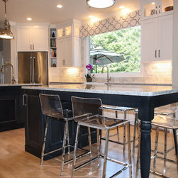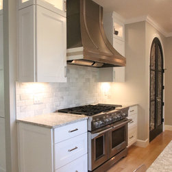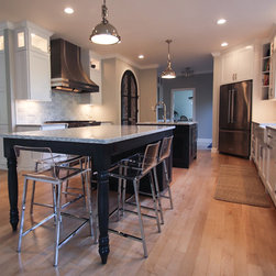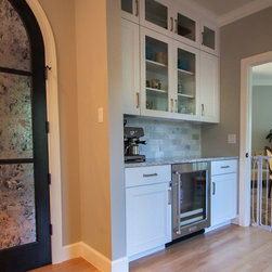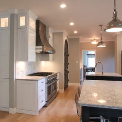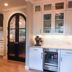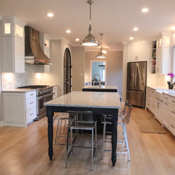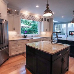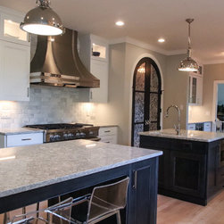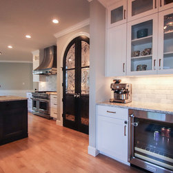 A Transitional Kitchen in Two Colors, Two Islands, Island with Seating Area, Glass Doors, 15" Upper Glass Doors, Full Clear Glass Cabinets, Open Shelves, Wine Cooler, Metal Hood, Apron Sink, Prep Sink on Island, Dishwasher Wood Front