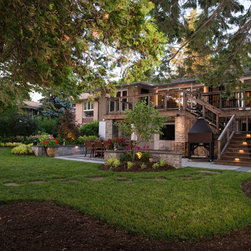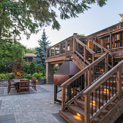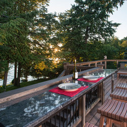 The Deck and Patio Design was truly inspired by the clients' 4' x 12' large picture pane window, on the bottom floor of the home. The deck rests on long spanned steel I-beams with concrete and stone pillar foundations that help maintain the very beautiful view of Lake Ontario. The clients were interested in a new upper deck space that could easily accommodate many friends and family, but could also be a comfortable perch in which to simply relax and enjoy the outdoors. A custom granite and stainless steel bar-top stretches along the deck rail, allowing for additional seating and a terrific place to enjoy your favourite beverage.