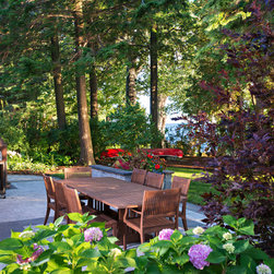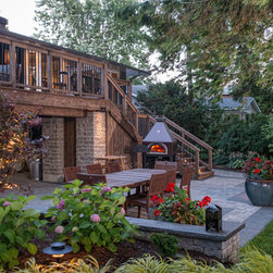 The on-grade patio space is great for dining, lounging and cooking your favourite home-made pizzas. Low pre-cast and stone capped knee walls create a perimeter barrier around the lower patio, while soft landscape lighting emits an evening glow within the space. Colourful perennials and shrubs have been added to complement the existing ferns, hydrangeas and trilliums.