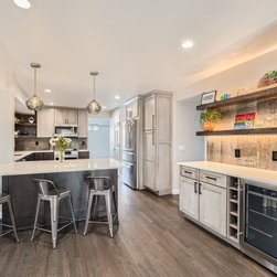 Brushed nickel hardware and stainless steel appliances keep the look cohesive and elevated, while subtle touches like open wood shelving and teal glass pendant lights introduce personality and texture. The wide-plank wood flooring anchors the space with warmth, making this kitchen feel polished, functional, and perfectly livable.