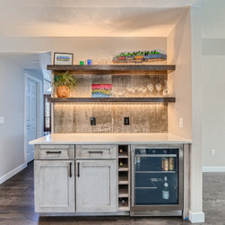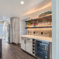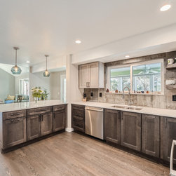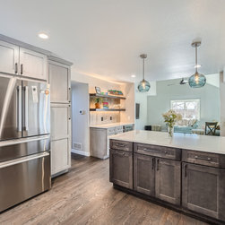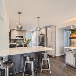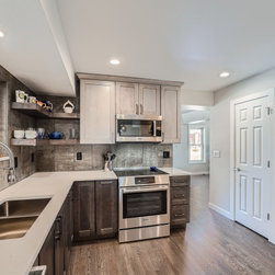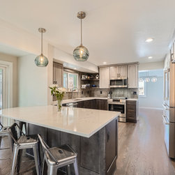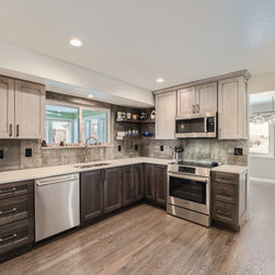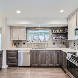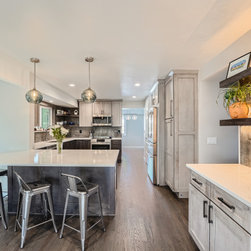 This kitchen blends moody sophistication with welcoming warmth, using a two-tone cabinet palette to define the space with contrast and character. The perimeter cabinetry in a soft, weathered gray pairs beautifully with the darker island base, while clean white quartz countertops provide a crisp, modern counterpoint.