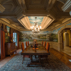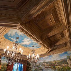 The interior is a combination of luxurious custom woodwork and a very sophisticated wall mural. The architectural ceiling is a multi-layered structure with an emphasis on details and complexity. All the elements of the millwork, like raised wall-panels, arched openings, architectural moldings, fluted columns, and the coffered ceiling satisfies the customer’s desire for luxury and distinction. The idea of the mural is a French-inspired landscape depicting old-world historic castles which are in harmony with the room's architecture. The woodwork is finished with the use of a special technique that highlights the details and accents the woodwork's dimensionality.