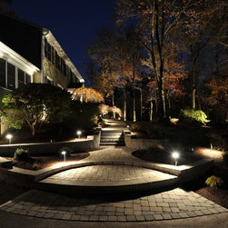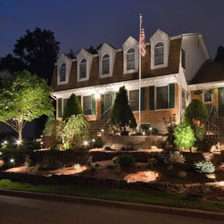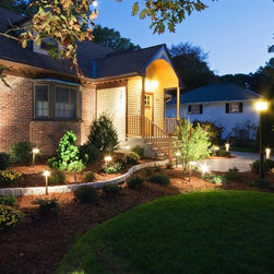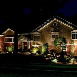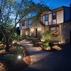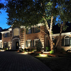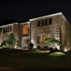 Foundation lighting systems are installed with aluminum oxide wiring for corrosion resistance. The fixtures blend into the landscape during the day and come alive at night washing the house with subtle illumination.