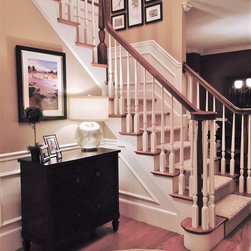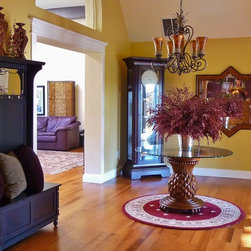 This elegant foyer welcomes family and guests with it's deep, red oak wood tones and richly saturated gold walls. White painted balusters and wainscoting contrast against the dark wood entryway table and intricately patterned area rug.