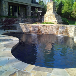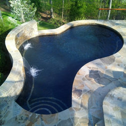 Freeform pool with raised wall, waterfalls and Diamondbrite Onyx plaster.