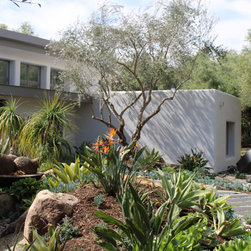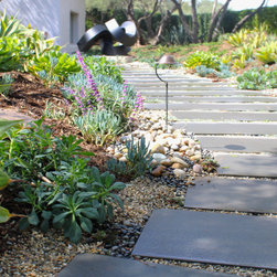 Pennsylvania blue stone is set in an off-set layout that leads to the front door. Low water succulents and specimen plants embrace the side of the walkway.