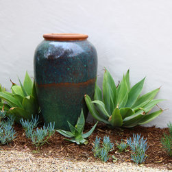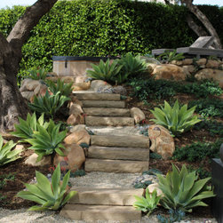 Chopped Cherokee Creek steps lead to the cedar hot tub in an elevated flagstone patio that overlooks the ocean. Low water plants such as agaves and blue chalksticks embrace the boulders around the set of stairs.