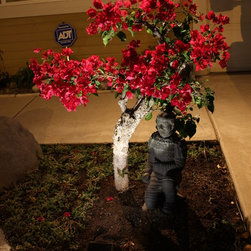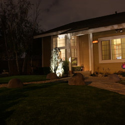 Night time view of Asian inspired drought tolerant front yard transformation.