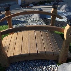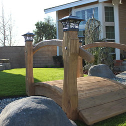 Custom built wood bridge with solar light post caps