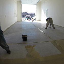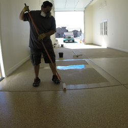 Barefoot Surfaces coating the fresh garage floor with finish.