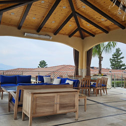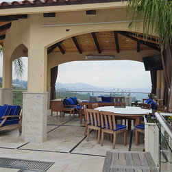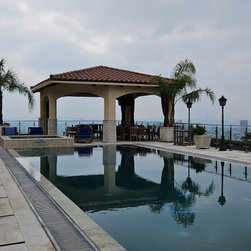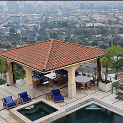 Backyard gazebo design to provide covered patio space, frame views, and match home's existing Mediterranean style
