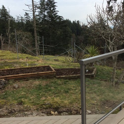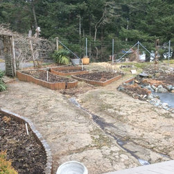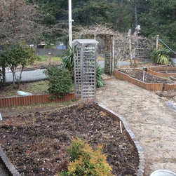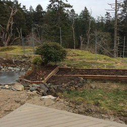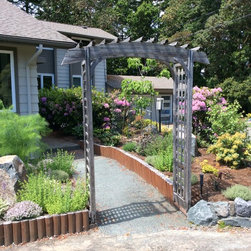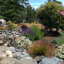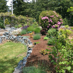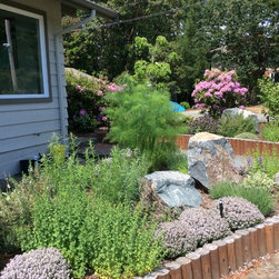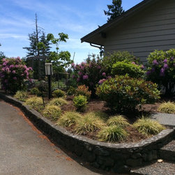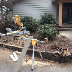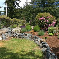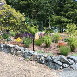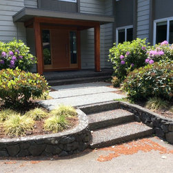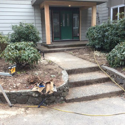 This amazing project was a 90% DIY project by couple of very enthusiastic and talented homeowners. We wanted to keep what was good in the old landscape and rejuvenate and up grade the rest. The new front entry side walk was poured by the home renovation contractor, but most of the balance of the work including the demolition, all to he planting and all of the building the dry stacked stone walls was done by this dynamic duo, under the expert coaching of one of my favourite landscapers. He also placed the boulders for them. In this photo the existing sidewalk didn't line up with the new front door entry portico so I redesigned the new one to complement the mid-century styling of the newly renovated home. Some work replacing the landscape ties still remains for a future phase - but the transformation is remarkable!