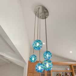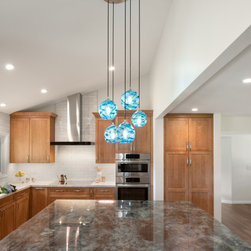 While the timeless appeal of all-white kitchens remains strong, these homeowners sought to infuse natural elements and vibrant colors to make their space truly their own. The newly vaulted ceiling enhances the open, airy feel of the kitchen, providing a dramatic backdrop for the grand island. Topped with an exotic Lemurian Blue countertop, the island offers a generous workspace and seating on two sides. The space is further enlivened by a custom-made, striking blue pendant light that adds a touch of elegance and personality.
