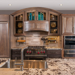 Custom open shelves and wine rack with detailed legs anchor the three sides of the island.