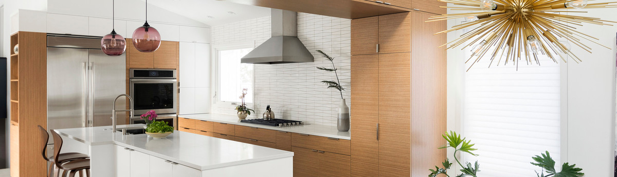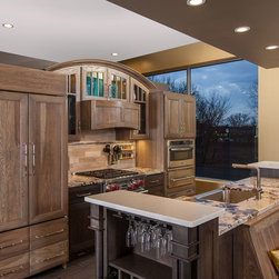 Two-toned cabinetry of wired brushed hickory with a grey stain wash, combined with maple wood in a dark slate finish is a current trend.