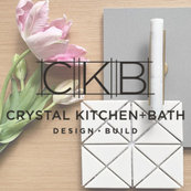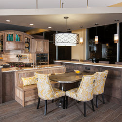 A floating soffit matches the shape of island and helps lower the showroom ceiling height to what would be found in a normal home. It includes: pendant lights for the snack bar, chandelier for the table and recess for task lights over the sink.