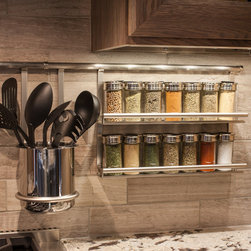 Backsplash rail with spice rack, knife and utensil holder add more storage space.