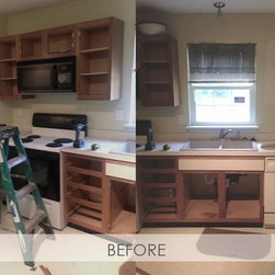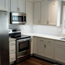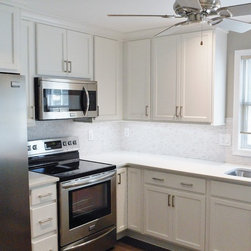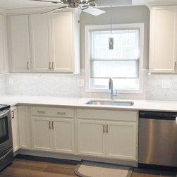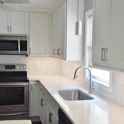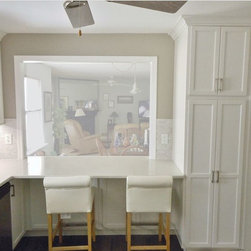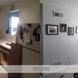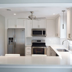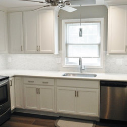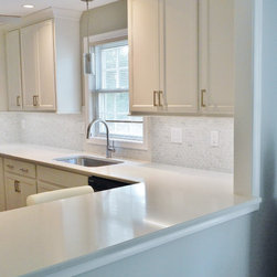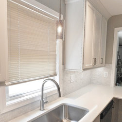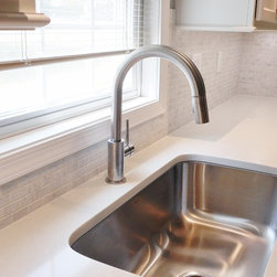 We used new takes on classic materials to make this light and bright kitchen appeal to both modern and traditional tastes. The kitchen was originally filled with builder grade materials, and had a poor lay out. By making the kitchen U – Shaped, we gained more storage, and counter seating. Opening the wall cut out was also a huge design improvement, and gives the kitchen a more open feel. We used wood-look tile, quartz counter tops, shaker style cabinetry, and modern appliances and fixtures to achieve the look.