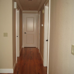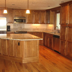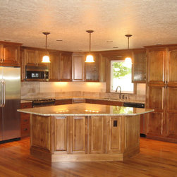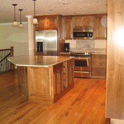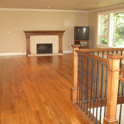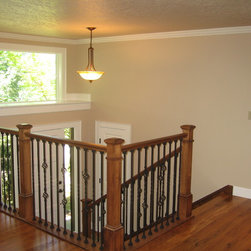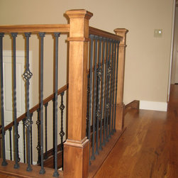 Custom stairs and handrail, Select Alder handrail with oil rubbed bronze iron balusters, Select Alder bottom cap, Solid Select Alder box newels with Hip detail on top.