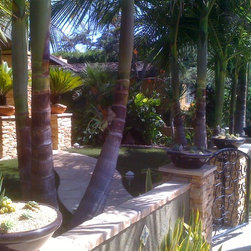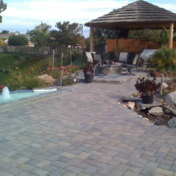 Javdani's back yard, paver, water stream and fall, palapa.