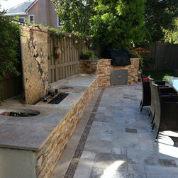Glaser's BBQ, for pit, water fall, seating bench and travertine patio.