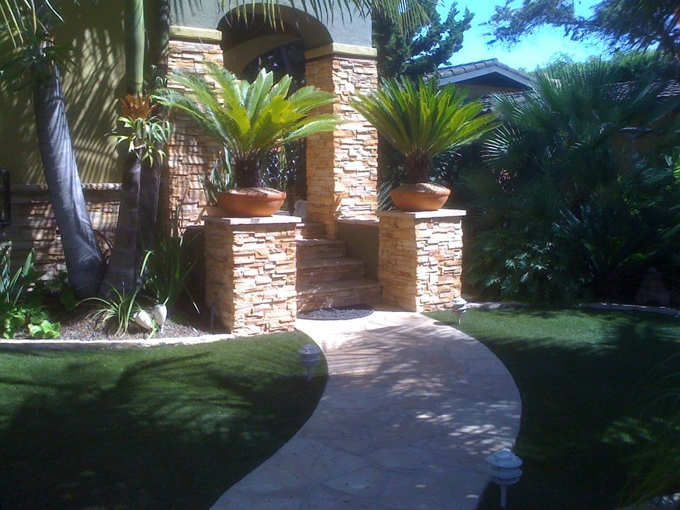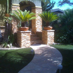 Front yard, synthetic lawn.