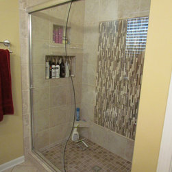 Roman Stone Beige 12x12 wall tile, 2x2 Russet Weddington floor tile, Java Strip Mosaic with Chiaro Pencil Liner, Chamois grout, Arizona Shower Door