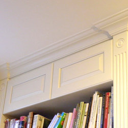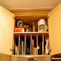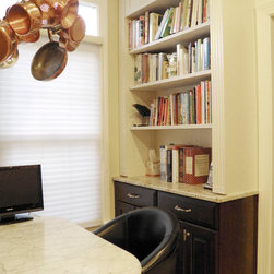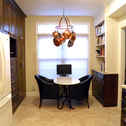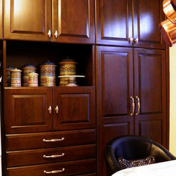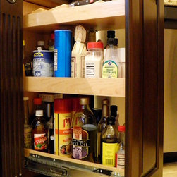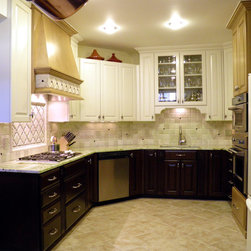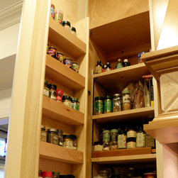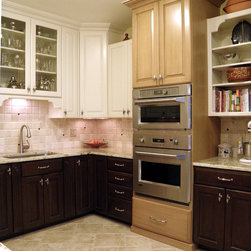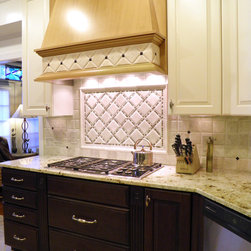 Project Features: Cabinets in Varied Stains and Paints; Custom Coventry Wood Hood with Ceramic Tile; Varied Height Cabinetry; Fluted Pilasters and Rosettes; Pull-Out Can Rack; Vertical Partitions in Oven Cabinet; Spice Rack with Adjustable Shelves on Back of Cabinet Door;