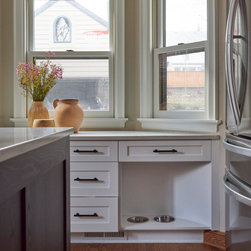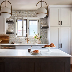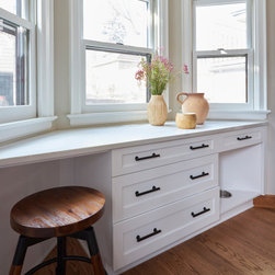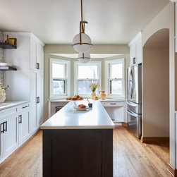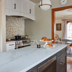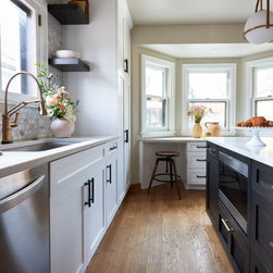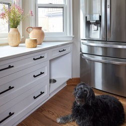 The owners of this 1937 Lannon stone Colonial wanted a more functional and up-to-date kitchen that would suit their family’s busy lifestyle. Rather than removing a wall, they opted to retain the original layout of a dining room at the front of the house and a kitchen at the back. We took the kitchen down to the studs and did some reframing of the inside wall to accommodate the new plans but left the original footprint intact. A custom-designed and -built island created more countertop and storage space while permitting enough clearance and a place for guests to gather.