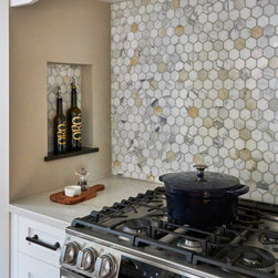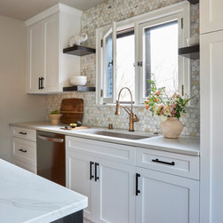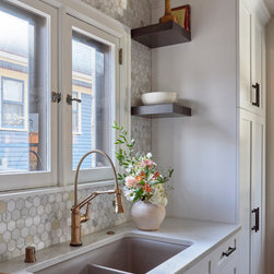 New oaks floors were stained to match the rest of the house, and other touches aligned current-day conveniences with the home’s vintage aesthetic: floating shelves for decorative items, niches for oil bottles, a food-bowl nook for their pet dog Lola, and a place to sip coffee in the morning. An onyx stain for the island and shelves provides a pleasing contrast to the white wood and marble.