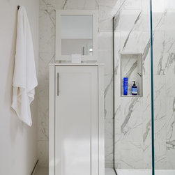 A demi-tall storage unit—in white with white top—provides convenient storage just outside the shower.