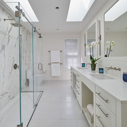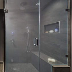 This client had designs on the perfect master bathroom—a stunning sleek retreat—within her NW Washington bungalow. She imagined a light-filled, white room with a spacious shower and ample storage. Pulling the corner tub made room for the master bathroom’s centerpiece: a frameless glass shower set...