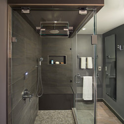His master bathroom—a handsome spa with steam—features anthracite porcelain walls and floors and a frameless shower with chunky bench for relaxing.