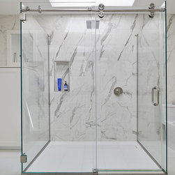 The master bathroom centerpiece: a frameless glass shower set against a dramatic wallof marble-look porcelain tiles.