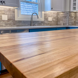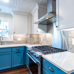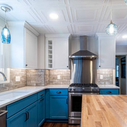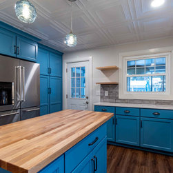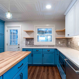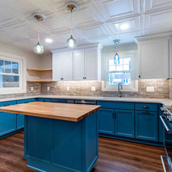 Beautiful kitchen remodel preserving the historical integrity of the home. Features include custom built butchers block, tin ceiling, grey subway tile, blue shaker cabinets, hand blown glass light fixtures and luxury vinyl plank style flooring.