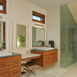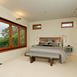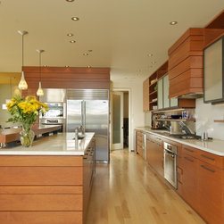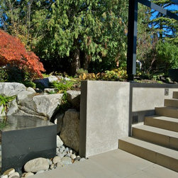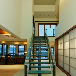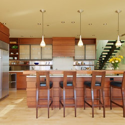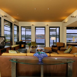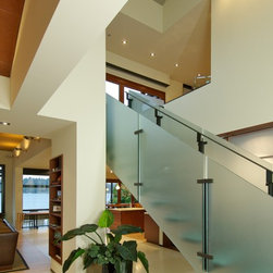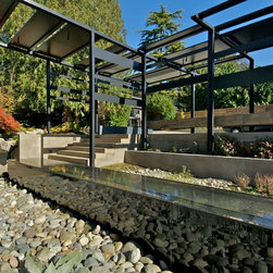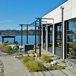 This extensive remodel gave new life to an old house with limited redeeming qualities. The final project is actually smaller in square footage than the original, and takes advantage of opportunities for outdoor living spaces. There was a desire to conserve some of the existing building rather than completely tearing it down and ultimately two-thirds of the original structure was preserved, concealed behind new additions and steel trellis work. Structural beams were saved and reused for benches and counters. On the property, the original concrete bulkhead was removed and a natural shoreline restored. There was also an effort to landscape primarily with native plants.