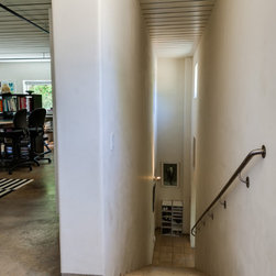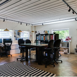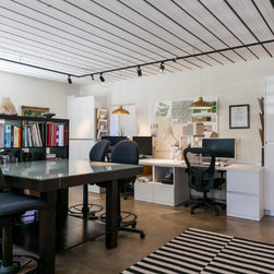 A home office and creative space that functions for employees to work and clients to visit. Details like white cabinets with black and gold desk details, black and white rug and gold pendant lighting make this space high style that performs. Polished concrete floors are easy to maintain. Large windows flood the space with natural light.