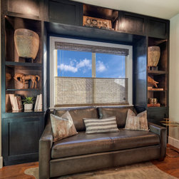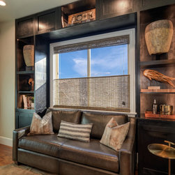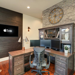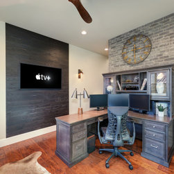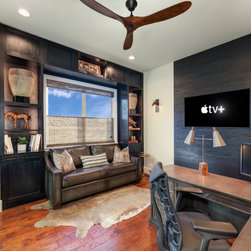 A black, tan, and grey home office with a brick wall and wood accents. A leather couch sits on a cowhide rug surrounded by a black wood built in showcasing unique accent pieces. The Samsung Frame TV sits on a black Stikwood background flanked by a pair of brass and black sconces. The grey stained...