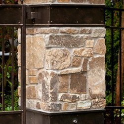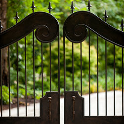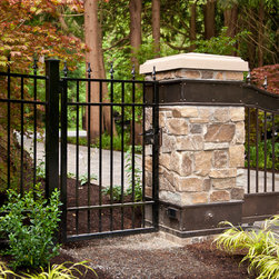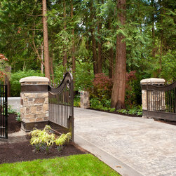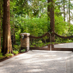 This beautiful, custom made, 15' gate was custom painted with an antique, faux finish and a clear top coat, to give it a stunning, aged look to withstand the harsh weather in the Pacific Northwest. Automated Gates fabricated the entrance gate with matching column bands and provided the telephone entry system. This gate project was completed in partnership with home builder Saad Custom Homes.